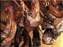 湘西土家人對腌臘制品有一種特殊的嗜好。每年一到冬至,家家戶戶都要?dú)⒛曦i,做臘肉。下水鮮吃,正肉、豬頭、豬腳全部用于做臘肉。土家臘肉的做法,首先將鮮肉砍成五六斤一塊的長條,然后放在大缸里(決不能用水洗),撒上鹽,淋入一些酒,再放入一些八角、花椒、辣椒之類的香料,最后用大石塊壓在上面進(jìn)行腌制。為了使肉入味均勻,隔一兩天就要把肉翻一遍。一個星期后,鹽味、香味都滲透到了肉里,這時再把肉取出來熏烤。 |